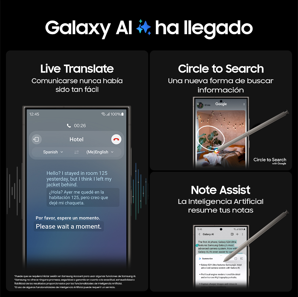 ¿Imaginas un dispositivo capaz de razonar, planificar y crear? Galaxy S24 Series no es un nuevo Smartphone más, es el primer AI Phone de Samsung. Galaxy AI ha llegado para cambiar la forma en como usamos nuestro teléfono. Navega y busca información sin esfuerzo, comunícate sin barreras de idioma o trabaja de forma más productiva e inteligente.